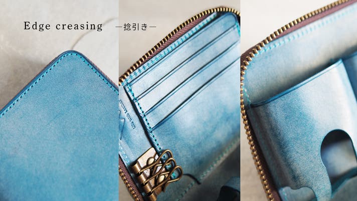革の縁に線(捻)を入れることで、革に陰影をつけて立体感を出すとともに、革の表情を引き締め、美しく仕上げています。