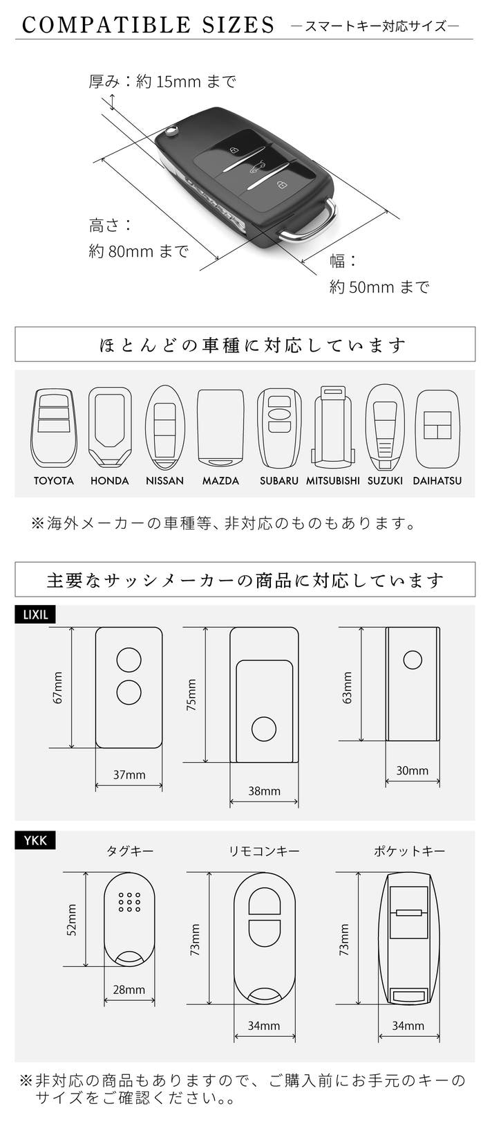 海外メーカーの車種等、非対応のスマートキーもございますので、必ず収納したいスマートキーのサイズをご確認ください。