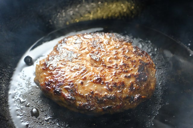 ハンバーグは解凍させることなく、そのまま調理可能です。必要なものはテフロン加工のフライパンと、ハンバーグ1個あたり50ccの水だけ。フライパンにハンバーグと水を入れたら、ふたをして弱火で7分、裏返して5分加熱します。次にふたを取り、両面2分ずつ加熱して焼き色を付けます。串を刺した時に、透明な肉汁が出たら出来上がりです。