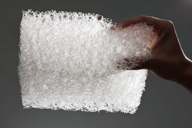 弊社の高反発マットレスの中材は、ポリエチレン素材が上の写真のように複雑に絡み合った立体網状構造体(りったいあみじょう構造体)です。