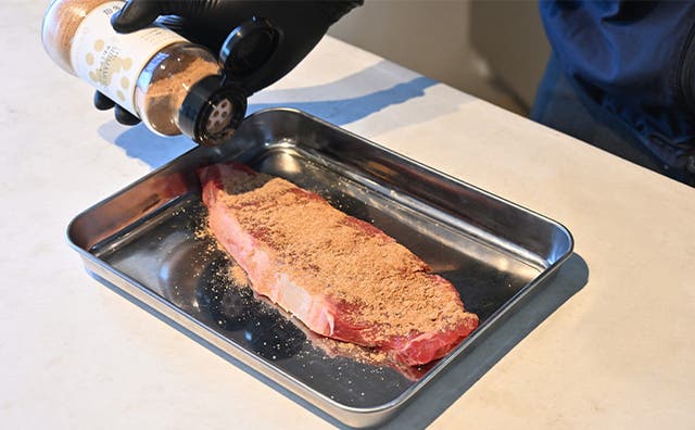 ① 特に固い赤身の牛肉には100gに3g程度のスパイスをてんぷら粉をまぶすように両面にもみ込んでください(鶏肉には2g程度)