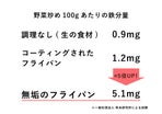 野菜炒めを調理する試験によると、無垢のフライパンで調理したものはコーティングされたフライパンよりも、鉄分量がおよそ5倍にアップ。