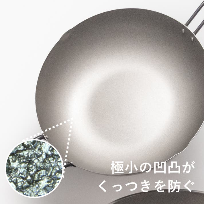 その名の通り肉眼では確認できない極小レベルの細かな凹凸をつけることで、するりとした表面でありながら油なじみが良く、焦げつきにくいというメリットを実現しています。