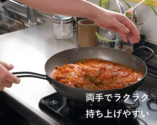 両手ハンドルのおかげで、煮込み料理のような重たくなりがちな料理も軽々と持ち上がります。