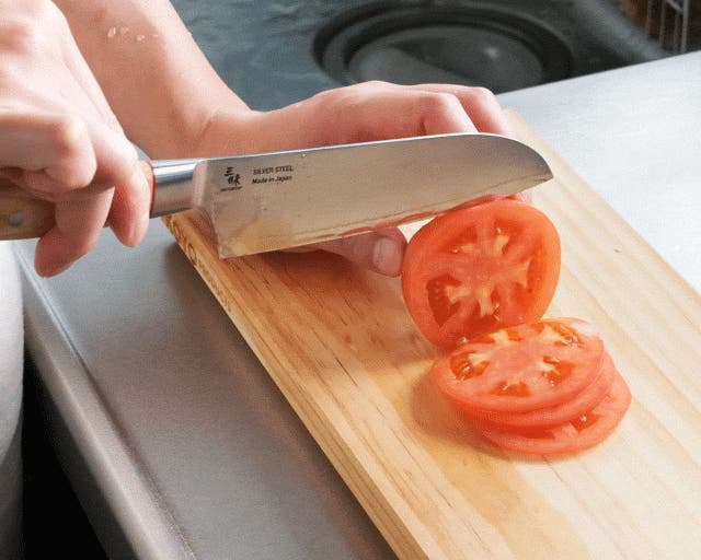 熟したトマトに刃をあてれば、しっかり表面にひっかかり、ほとんど包丁の重さだけでスーッと切れていく。滑りやすい鶏肉の皮も、逃さずに捉える。
