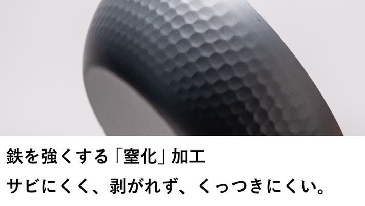 鉄製品の宿命だった「錆びやすさ」を、窒化処理によって大幅に改善。従来の鉄鍋のような面倒な使い始めのシーズニング(空焼き)も不要。