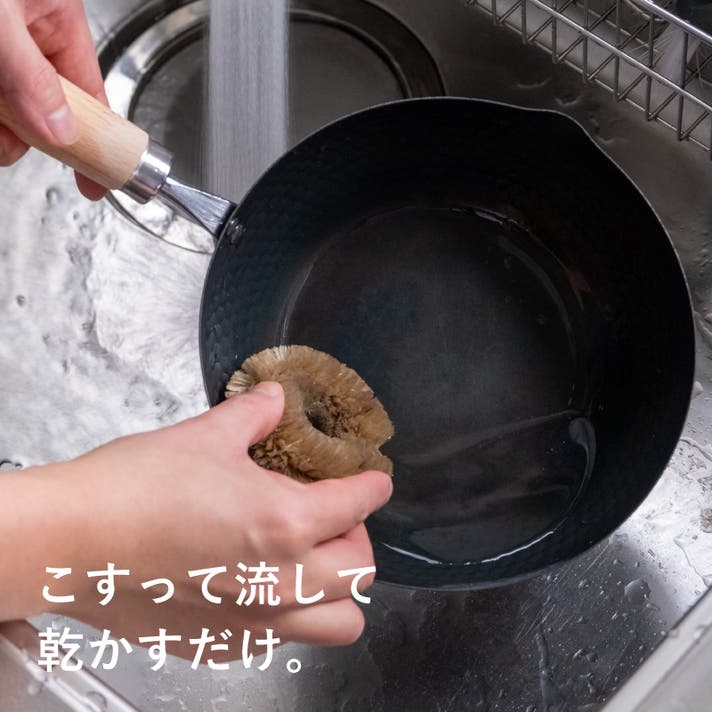 使い終わった後はタワシでさっとこするだけでお手入れも簡単。鉄鍋のハードルをグッと下げてくれます。