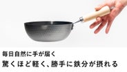 窒化処理によって強度を高めているため、本体を薄く、軽量に仕上げることができました。女性でも片手で楽に扱え、炒め物や盛り付けの際も手首に負担がかかりません。