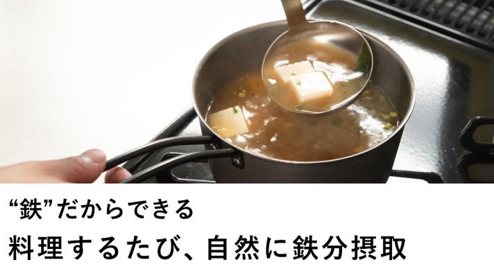 私たちはこの特性に着目。毎日の味噌汁や副菜でも、手軽に鉄分が摂れれば、という想いから、片手鍋に使われる素材としては珍しい鉄をあえて採用。ナノエンボスフライパンシリーズに鉄の片手鍋が誕生しました。