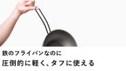 ナノエンボス加工を施したフライパンは、タフな鉄製なのに、驚きの軽さ。油馴染みが良くてくっつきにくく、シーズニング不要という、これまでの鉄フライパンのイメージを覆します。日本を代表するキッチンウェアの産地、新潟は燕三条生まれの高品質なフライパンです。