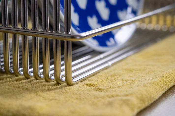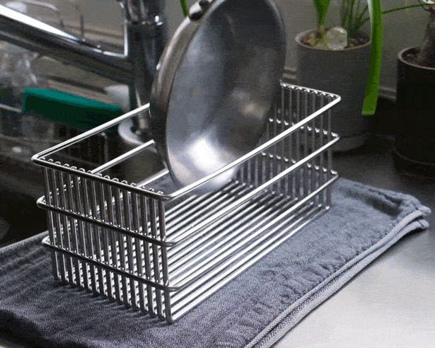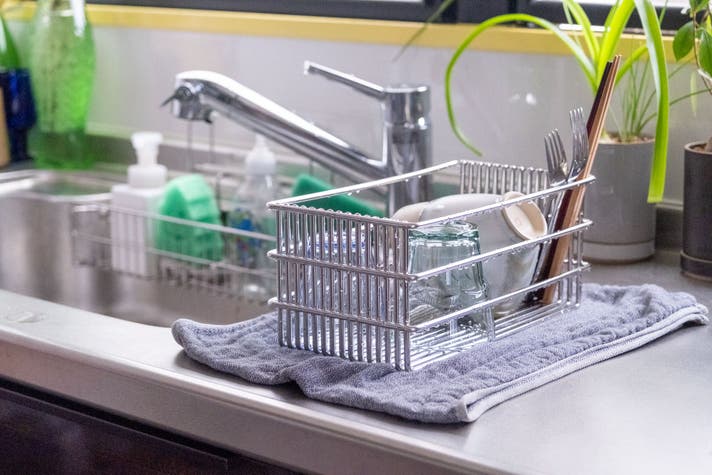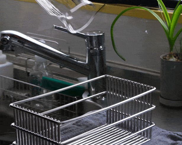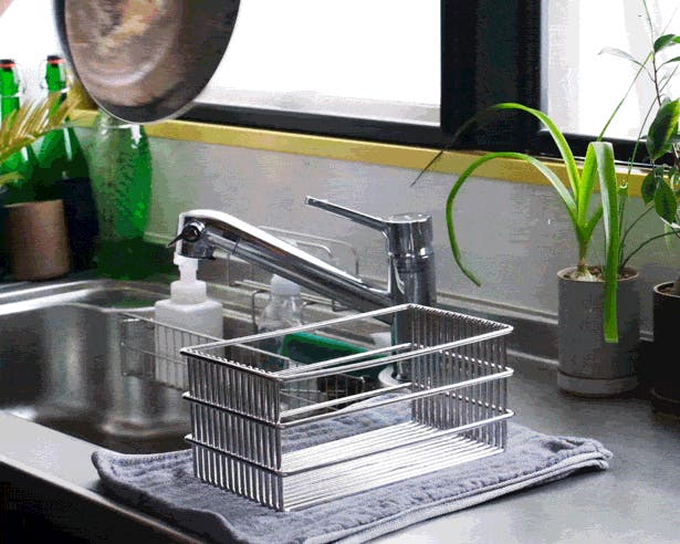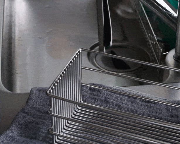 シンク内に水切りラックを置いてお皿を置き、最後に振って水を切る、という使い方も。これなら台やタオルを余計に濡らしてしまうことがありません。