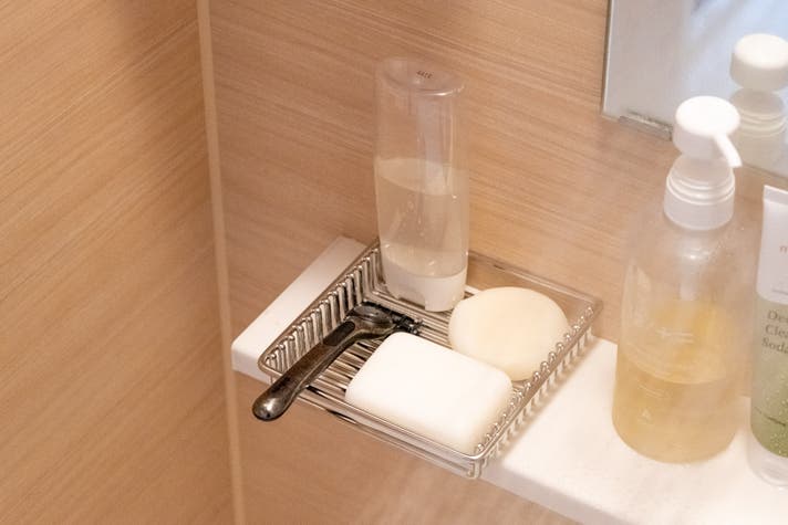 トレイは、お風呂場での水切りバスケットとしても優秀。石鹸やカミソリ、シャンプーボトルなどを置いておくことができます。