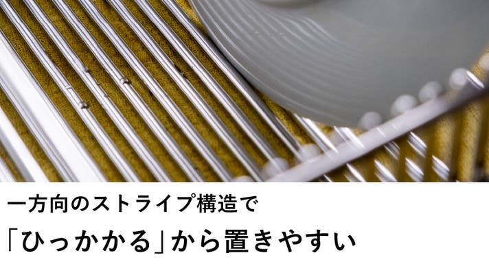 5mmという極太のステンレスワイヤーをストライプ状に配置したことにより、お皿のフチをスキマに引っかけ、滑ることなく安定して立てかけやすい設計です。