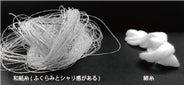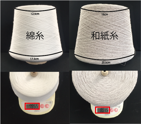 和紙糸はとても軽く、ほとんど同じ太さ、重さの綿糸と比べると体積が大きく違ってきます。