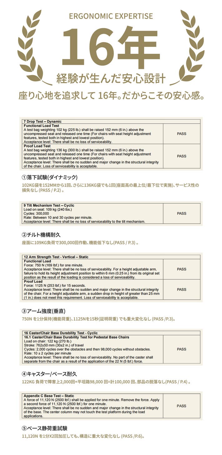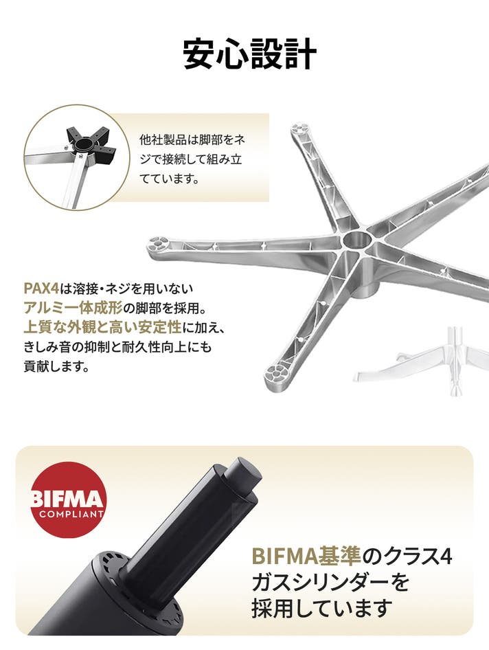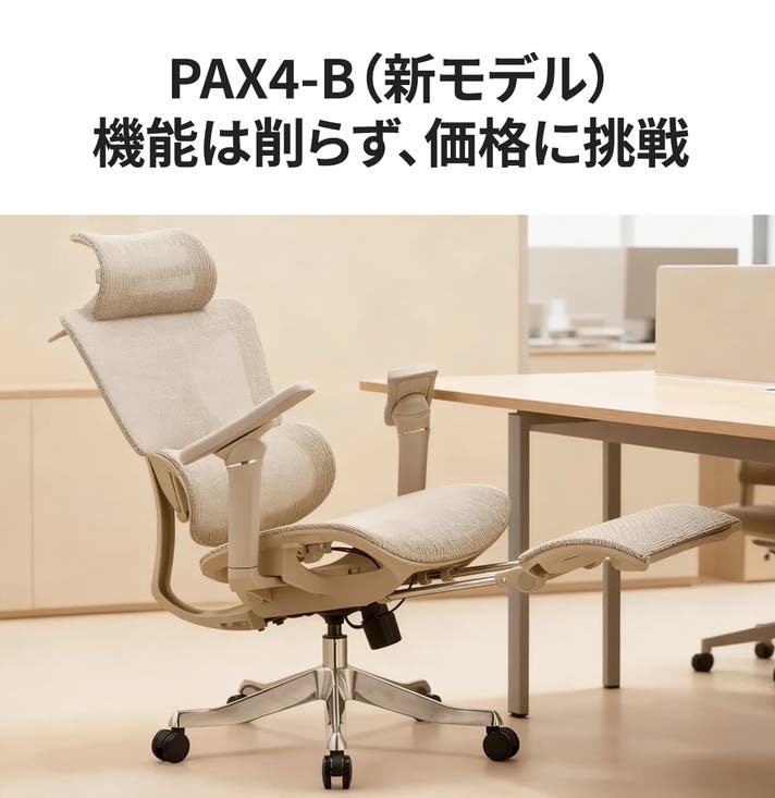試験サンプルは PAX4-D(アルミ合金背もたれ支持)を用いていますが、機能・調整機構は PAX4-B と共通です。サンプルとの相違点は背もたれ支持の素材のみとなります。