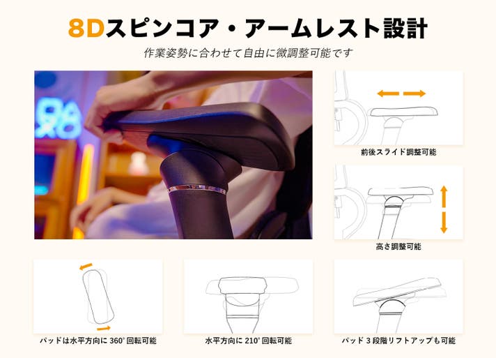 - 360度全方位8Dアームレスト&150°リクライニングで仕事も休憩もさらに快適、集中サポート