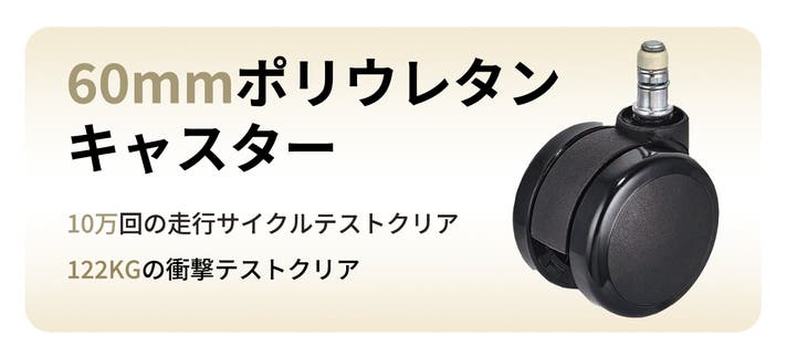 ナイロン構造にPUで覆われたキャスター。外周のPU層が床との接触をやわらげ、軸元の緩衝リングが金属同士の当たりを抑える設計です。