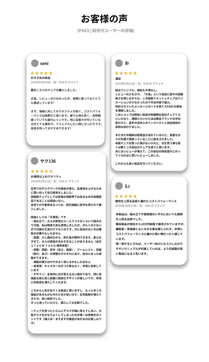精密な“2軸”調整(前後4cm可動+背もたれ5段階)と弾性腰枕の追従性により、Pax4は体型も姿勢も選ばず最適にフィット。細身からがっちり体型まで、在宅ワーク・ゲーム・読書などあらゆるシーンで、長時間でも安定した腰サポートを実現します。