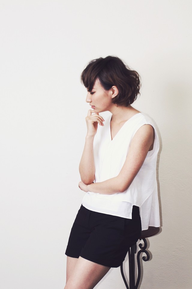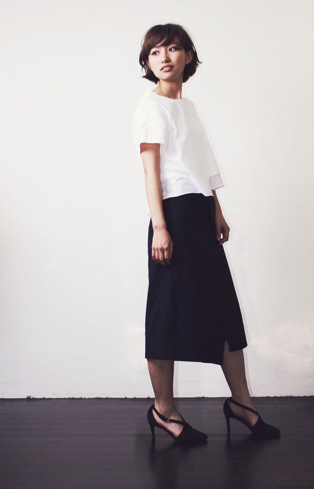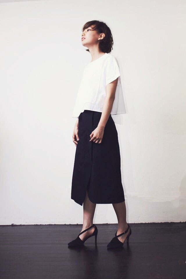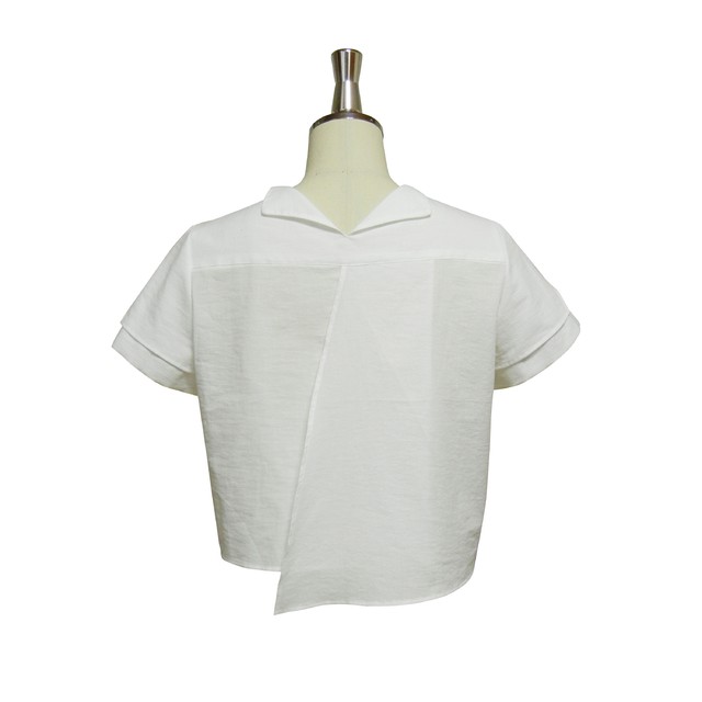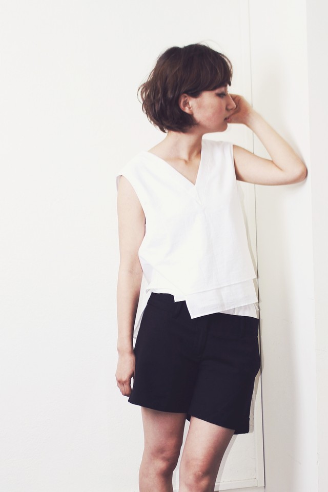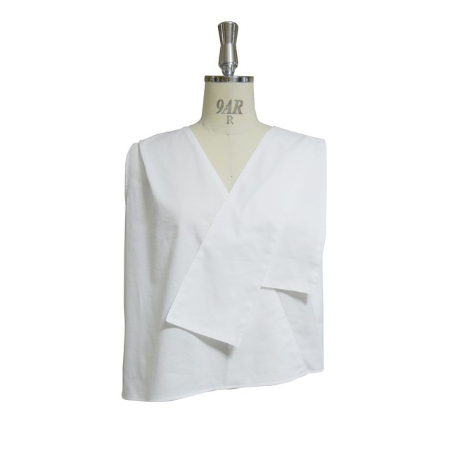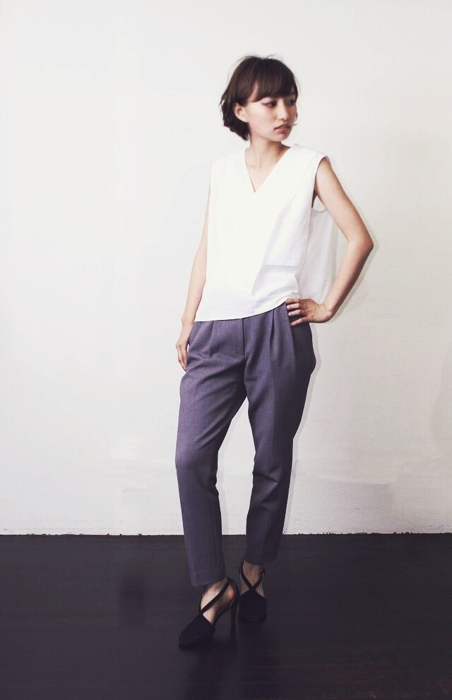 正面、横、後ろ、どの方面から見てもシルエットが変わるようにデザインしました。Vネックですので、首元をスッキリみせることができ、バックは少し長めに丈をとり、ふわりと動きを持たせるデザインになっております。