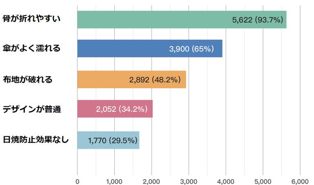 その他にも、漏水や傘の布地の破損などにストレスを感じている方も多いという結果がでています。上記の調査に限らず、「傘の耐久性」が日頃から使う上でストレスに感じるという方も少なくはないでしょう。