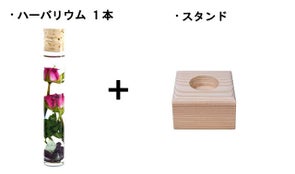 ドライフラワーなどの花材を特殊なオイルに浸しボトルに入れることで、みずみずしい状態で鑑賞できる新感覚のインテリアです。