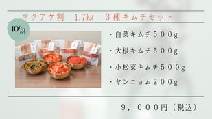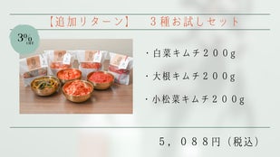 白菜キムチ、大根キムチ、小松菜キムチのいずれ一つ:500g