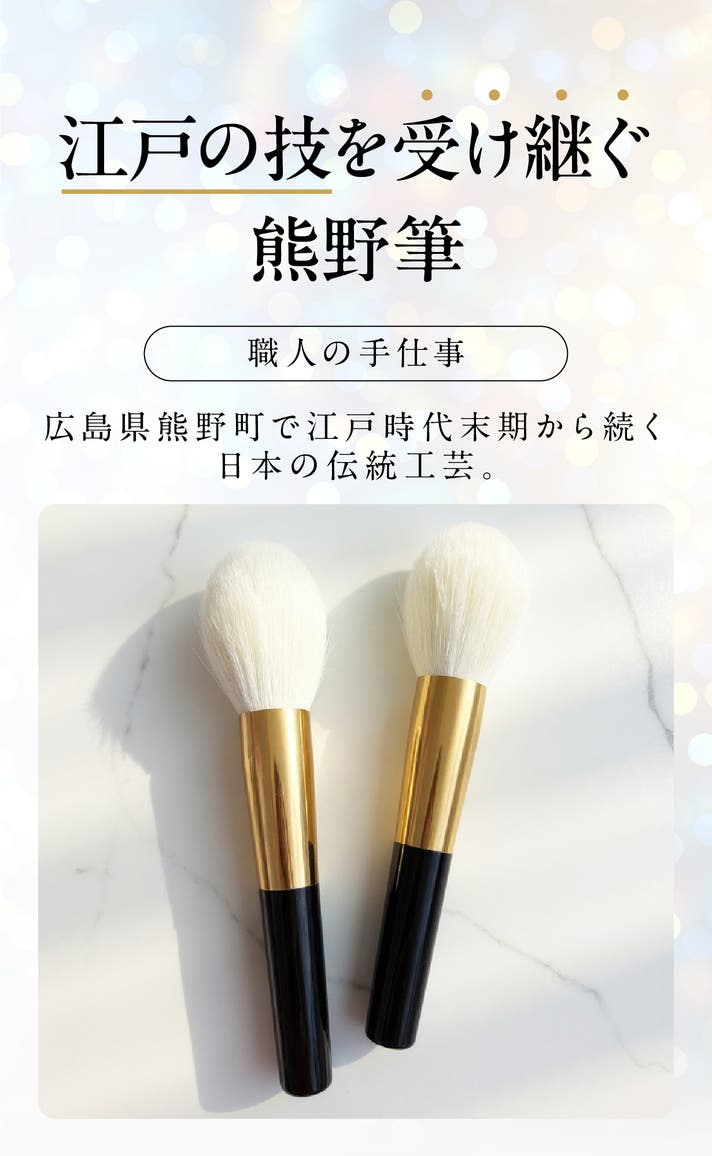 広島県熊野町で江戸時代末期から受け継がれてきた熊野筆の技を、毎日の洗顔へ。近年は化粧筆としても世界に認められてきた職人技を土台に、一本一本を手仕事で仕立てた洗顔筆です。毛先は均一で密度が高く、やわらかな肌あたりと確かな耐久性を両立。1975年に経済産業省の伝統的工芸品に指定された熊野書道用筆。由緒ある品質は、海外のハイエンドメイクブランドからも厚い信頼を得ています。