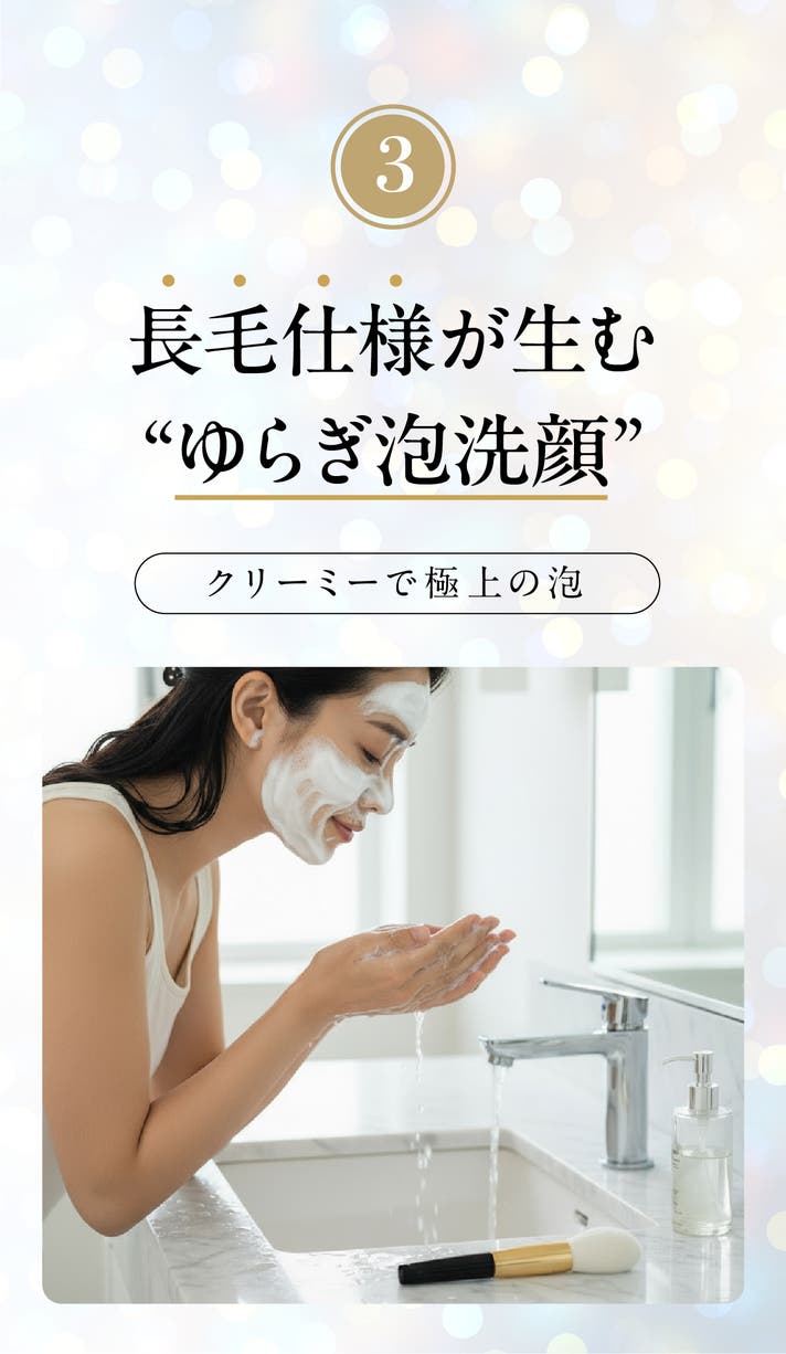 約49800本の高密度設計で面でやさしく触れ、空気を含んだふわふわの泡を素早く作ります。万一刺激を感じる場合は、毛先ではなく毛の腹を使えばさらに穏やかなタッチに。圧倒的な毛量と均一な当たりが、毎日の洗顔を上質な体験へと導きます。
