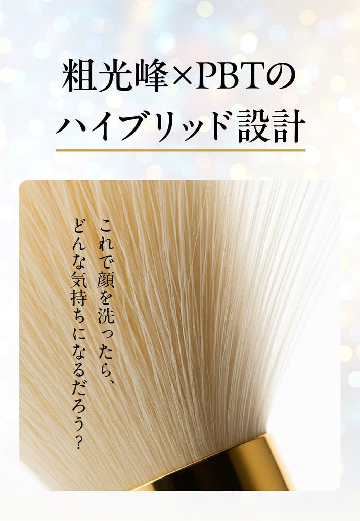 素材は高級山羊毛の粗光峰とPBTのハイブリッド。粗光峰のしなやかな肌当たりと泡含み、PBTの弾力・形状保持・速乾性を組み合わせました。やさしく滑るタッチで刺激を抑えつつ、使い終わりは水切れがよく衛生的。長期使用でもヘタりにくい耐久性を実現し、名門・熊野筆の手作りで理想の洗顔筆に仕立てています。