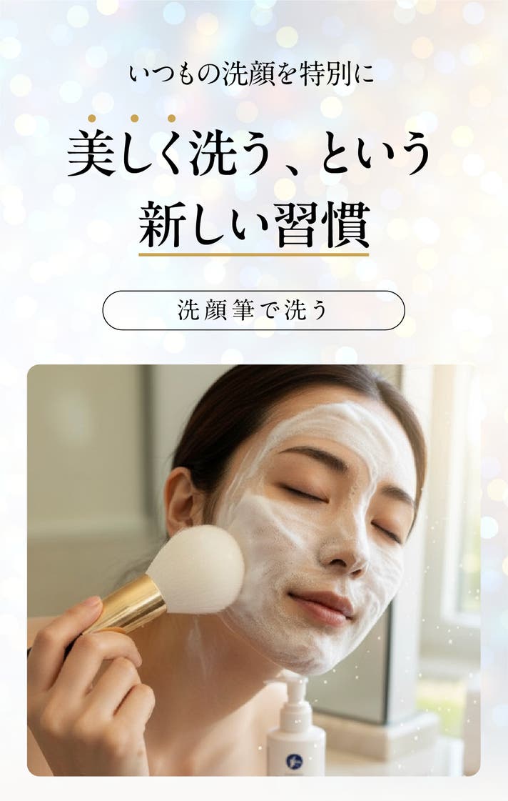 A. 泡立てるタイプの洗顔料がおすすめです。筆先が空気を含み、きめ細やかな極上泡を素早く作ります。泡を筆先に含ませて“撫でるように”洗うことで、肌を守りながら汚れを落とすことができます。