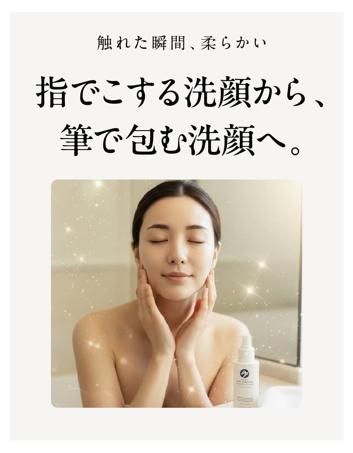 熊野筆の伝統と技術から生まれた、洗顔ブラシ。あえて長く設計されたこの洗顔筆が、まるで空気をまとったような柔らかさと、包み込むような弾力を実現しました。