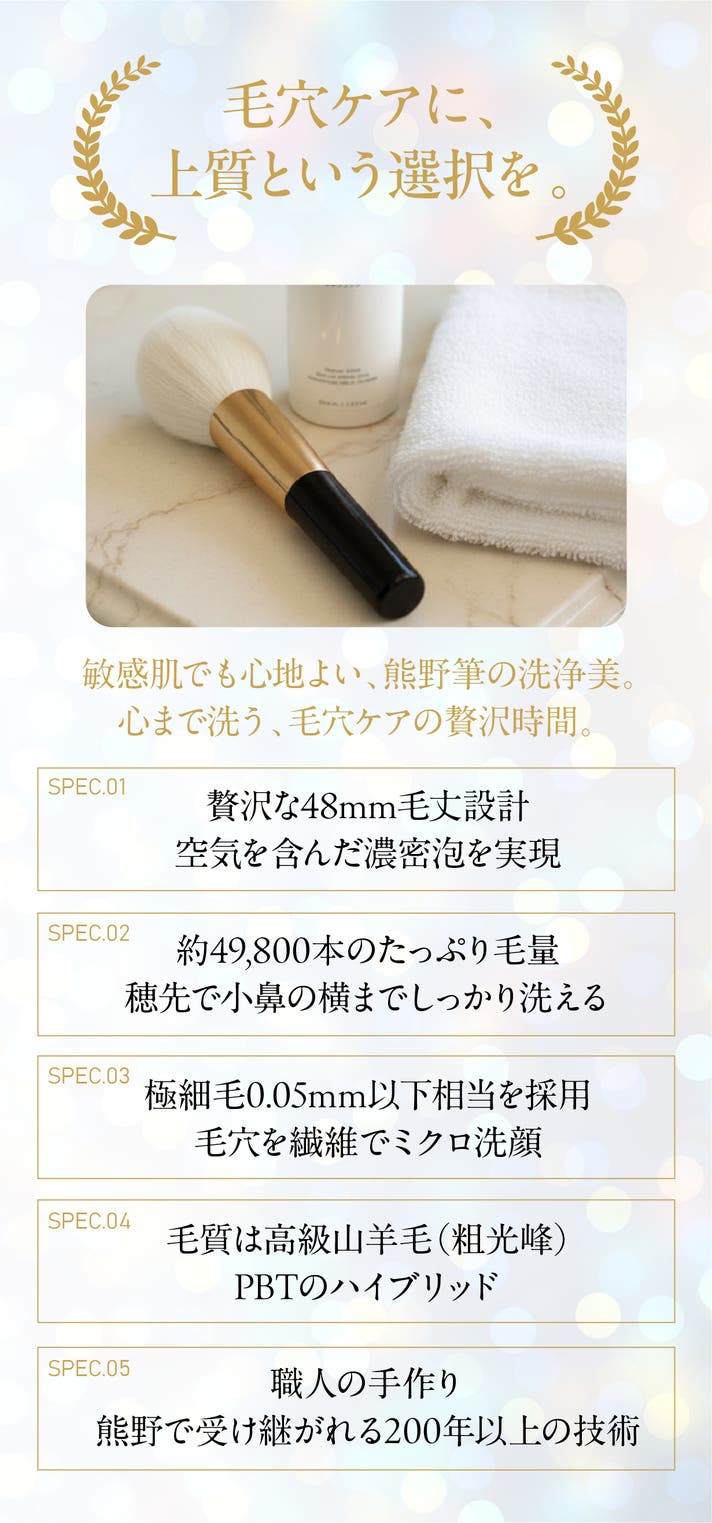 洗顔ネットを超える濃度の泡を、手早く。1830年ごろから受け継がれる熊野筆の技術。1975年に熊野書道用筆は伝統的工芸品に認定されました。約49800本の繊維密度が、触れた瞬間の心地よさと澄んだ洗い上がりをかなえます。