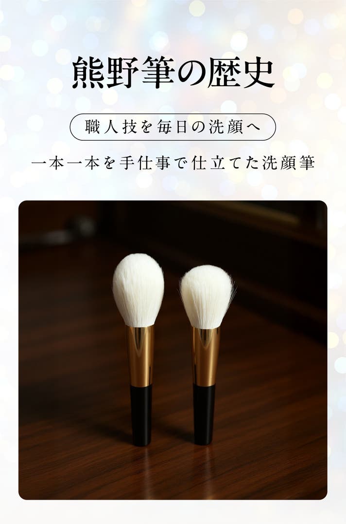 初めて肌に触れた瞬間、そのやさしさに驚き、 「この筆で洗顔できたらどんなに心地いいだろう」と感じたのです。そこで、 「毎日使えるやわらかさ」と「汚れを落とす確かな洗浄力」を両立する 洗顔専用の熊野筆を開発することにしました。毛の長さ・密度・コシを調整し、肌の弱い方でも使える“本物のやさしさ”を実現。