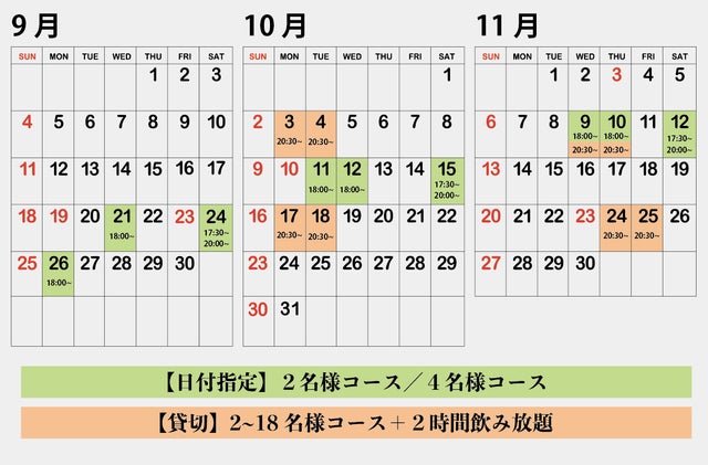 ■【11月9日18:00~】2名様コース(3枠)/4名様コース(3枠)
