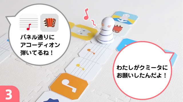 クミータはパネルの上を通過する際、それぞれのパネルに印刷された指示を読み取り、曲がる、回転する、音が鳴る、光るなどの様々な動作を楽しめます。