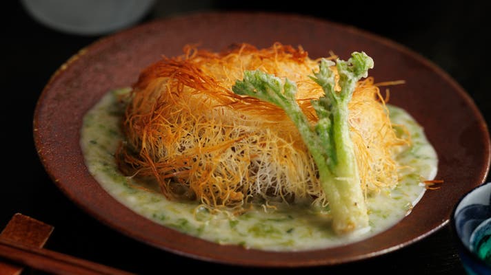 脂の乗ったサーモンを西京味噌に漬け込み、極細の麺状の生地「カダイフ」を纏わせてパリパリに焼き上げました。 西京味噌の芳醇な香りと、カダイフのサクッとした食感。そこに磯の香りが広がる「特製生のりクリームソース」が絡み合う、和と洋が融合した至福の一皿です。