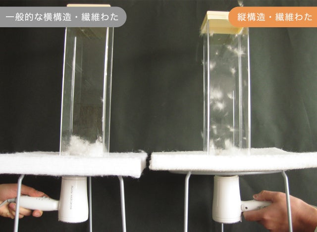 右側の縦構造繊維わたは中の羽が舞っていることから、通気性の良さがわかります。