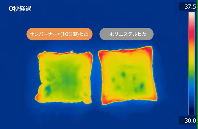比較を開始してから30秒ほどで左側のサンバーナー®︎混わたが湿気を吸収して発熱し、わたの温度が上昇していることがわかります。