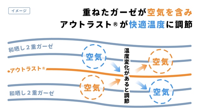 和晒しガーゼの持つ通気性と保温性に、アウトラスト®︎の温度調節機能が合わさることで、寝ている間の体温や室内の温度変化に反応し、 寒すぎず・暑すぎない『快適温度=快温』をキープします。