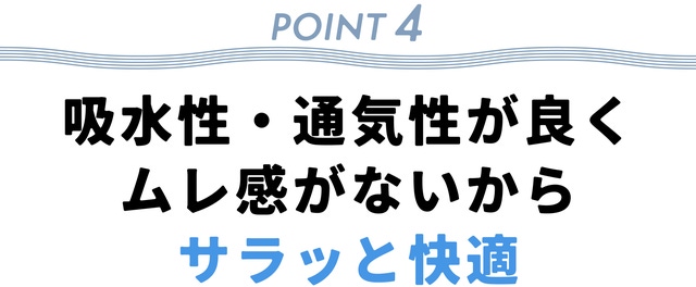 また、粗めの平織り組織は、空気の通り道が大きく通気性に優れているため、汗や湿気を素早く吸収することができ、 ムレにくくサラッとした肌触りです。