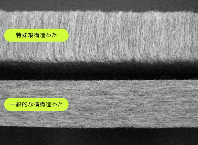 クッション材に使用しているわたは特殊な縦構造素材で、繊維が縦方向に並ぶことで通気性に優れ、蒸れにくく衛生的です。