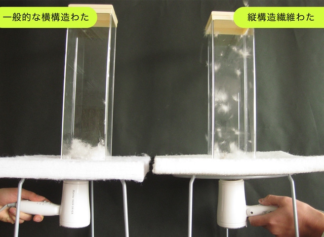 右側の縦構造繊維わたは中の羽が舞っていることから、通気性の良さがわかります。