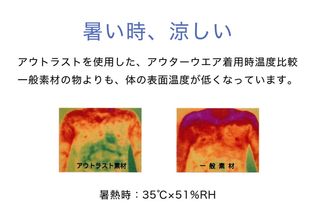 アウトラストⓇはNASAが宇宙空間で使用するグローブのために開発された技術で、厳寒の天候下でも寒くなりすぎないように、また、高温の環境下でも暑くなりすぎないように、身体の皮膚表面温度を管理・維持するように機能する快適温度調整素材です。