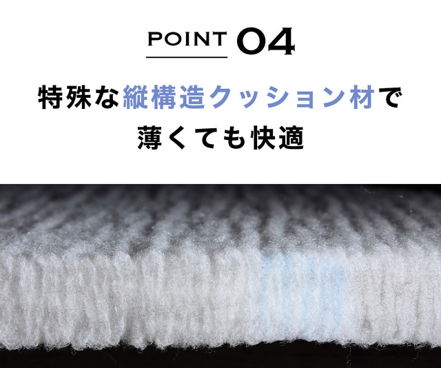 クッション材に使用している中わたは、繊維が高密度に縦方向に並ぶことで、従来の横構造繊維のクッション材に比べて高い反発性が生まれ、上からの沈み込みを下から支えます。