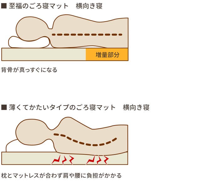 薄くてかたいタイプのごろ寝マットだと横を向いたときに肩が圧迫されてしまいますが、至福のごろ寝マットはボリュームがありしっかり支えてくれるので、横を向いたときでも快適な寝心地です。