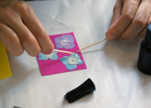 はなびらをUVレジンでコーティングして、アクセサリーを作ります。