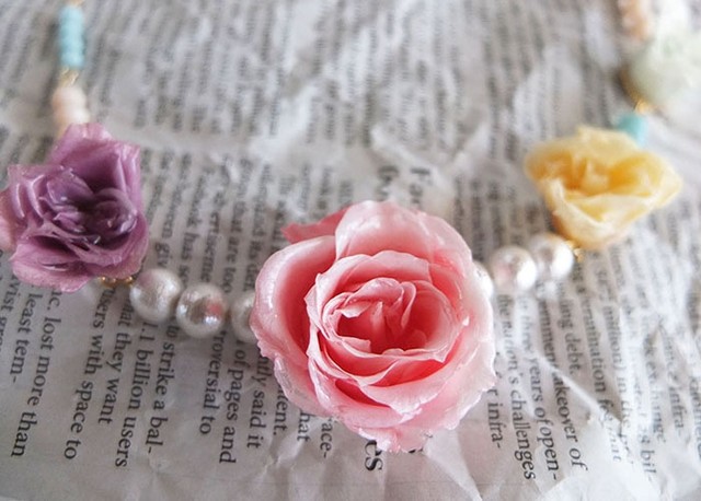 小さなプリザーブドフラワーを3つ使用したネックレスです。