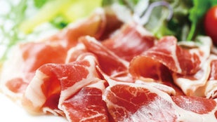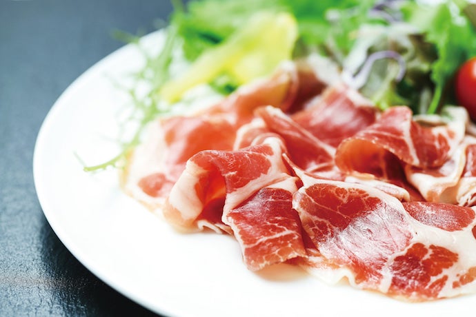 生ハムのカット面には、長期間良く熟成されたものにみられる米粒ほどの小さな結晶体「ハムストーン」が見られます。