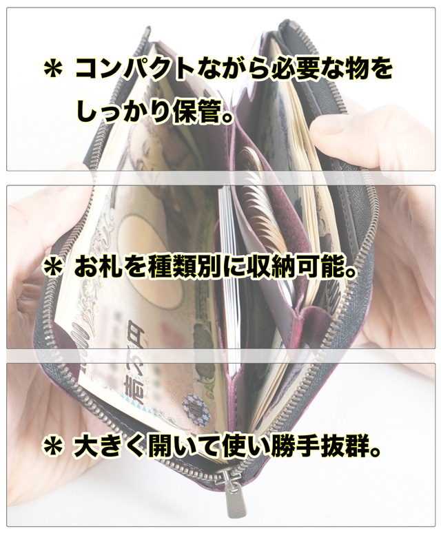 サイズ感は従来のコンパクト財布を継承しつつ、シンプル イズ ベストを基本に、こだわりである2か所の紙幣ポケット、カード入れ、取り出しやすい小銭入れ。また今回は大きく開くL-ZIPの新商品を開発。
