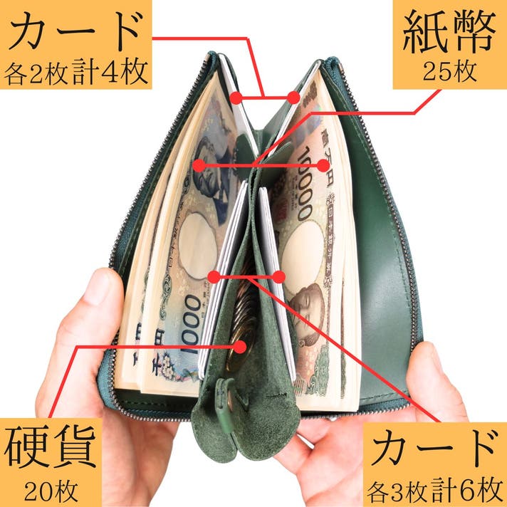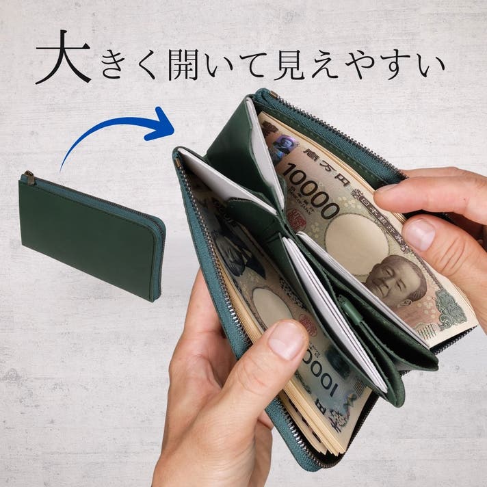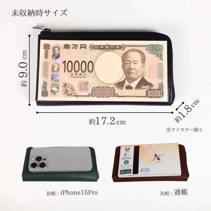 - 1万円札と同サイズ。最低限の収納スペースながら必要なものはしっかり収納できる小型長財布